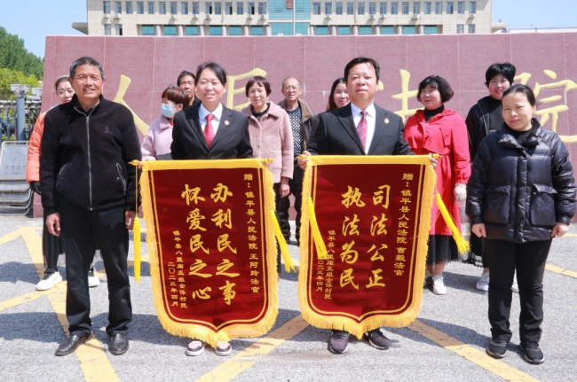 4月25日,一起行政诉讼案件的群众代表将锦旗送给行政审判庭曹毅法官和法官助理王阿玲,对镇平县人民法院司法为民公正司法表示感谢。