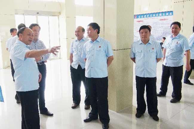 庞景玉院长一行先后参观了镇平法院诉讼服务中心、一号大审判庭、视频网络直播审判庭、文化建设及院内绿化等。
